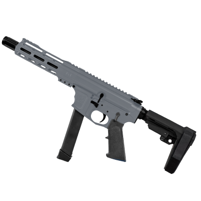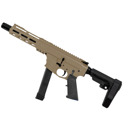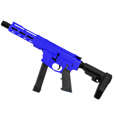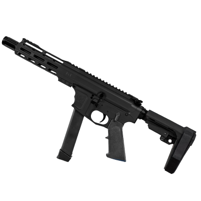 This AR-9 pistol combines a 6061-T6 slick-side billet upper with an MPI-tested nitride blowback BCG for dependable performance. The 7" 4150 CMV 9mm barrel with a 1:10 twist delivers solid accuracy, capped with a 7075-T6 solid aluminum flash can to manage blast. A 7" ABC top-cut MLOK handguard with a steel barrel nut offers durability and versatile mounting in a sleek package. The forged 6061-T6 charging handle features a USA flag engraving for added flair. The Glock-compatible billet lower is equipped with ambidextrous safety controls, extended takedown pins, a classic A2-style grip, and a 6oz heavy buffer system to handle recoil.